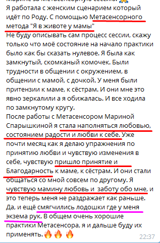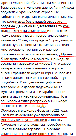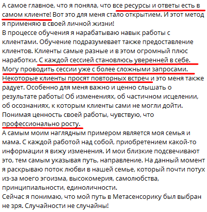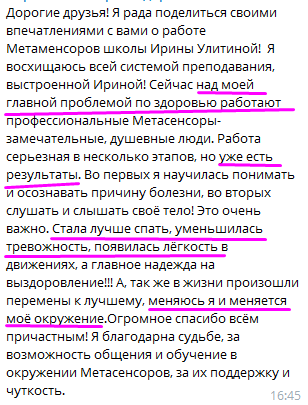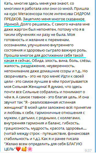 После каждой метасессии я ощущала прилив энергии постепенно уходили боли, практики были такие сильные мощные, особенно практики прощения исключения из Рода абортированых детей, проработки родовых программ, сценариев рода отца и мамы...