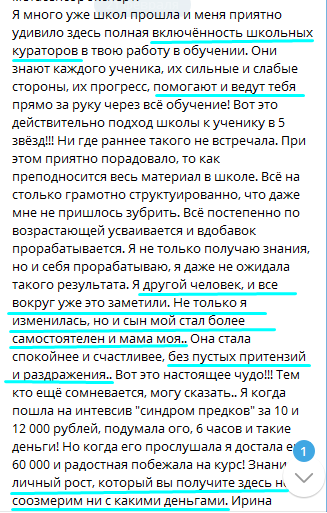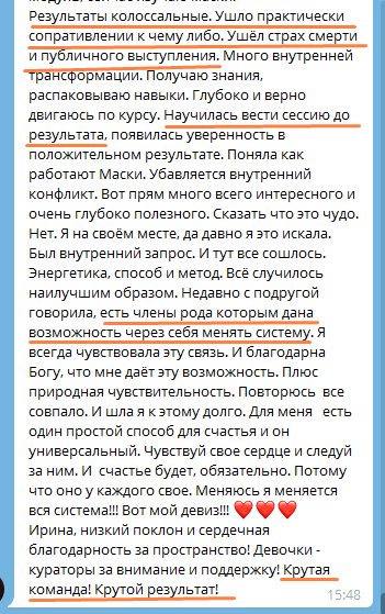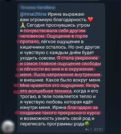 С первого модуля обучения жизнь перевернулась на все 180 градусов. Ирина даёт очень много материалов, практик, техник. И самый первый я испробовала на муже. Старшая дочь сказала: "Мам, а это точно наш папа?"🤣 Он стал нежнее, спокойным, понимающим, внимательным. И я поняла, что вся магия во мне. Я была в таком восторге, вы просто не представляете! На сегодняшний день в ходе обучения я узнала своё предназначение, узнала о поведенческих масках и нашла их в близких ( теперь я много понимаю в их поведении и понимаю, как с ними общаться), разобралась с родовыми программами и переплетениями, и как они влияют на мою жизнь (самое главное, что это можно исправить!), нашла своё место в роду (с детства чувствовала себя белой вороной, потому что ни с одной стороны меня не принимали), восстановила связь с Родом, почувствовала энергию отца и матери... Писать можно очень много! С мужем наладила контакт, дети стали спокойнее, открытыми, я их слышу и понимаю, также они меня, с мамой полная идиллия, родные со мной начали общаться и принимать моё мнение, окружающие вообще душки 🌺 А самое главное, я поняла себя, подняла самооценку, стала уверенной, чувствую свой стержень внутри, чувствую свою свободу, любовь и знаю как восстановить ресурсное состояние.