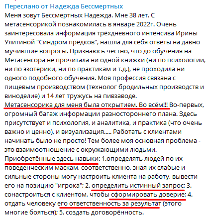 Какие результаты получила ? Оказалось, что, попав на обучение, я ещё и внесла крутые изменения в свою жизнь. Я закрыла все свои кредиты, увеличила свой доход, улучшились взаимоотношения с родственниками (мы стали чаще встречаться, укреплять родовые традиции); мой сын, сидевший до 24 лет дома после окончания техникума и никак не реагировавшие на наши с мужем обращения к нему начать жить самостоятельно, уехал в другой город, начал работать, встретил прекрасную девушку. Огромные изменения произошли и со мной: я стала увереннее, научилась обозначать свои личные границы, выросла моя самоценность. Ну и, конечно, я получила очень эффективные алгоритмы и техники работы. Я бесконечно благодарна Вселенной за такой щедрый подарок как встреча с Ириной Улитиной, как Школа метасенсорного коучинга, как прекрасные душой кураторы и ученики школы. А иначе в этом пространстве развития, поддержки, безусловной любви и быть не может.❤️❤️❤️❤️❤️