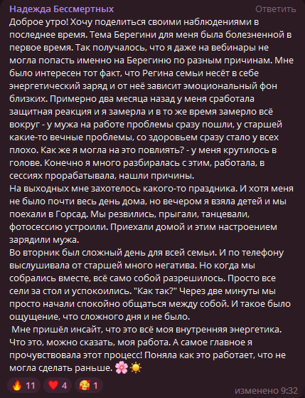«Хочу поблагодарить Ирину Улитину и всех организаторов за курс «Метасенсор для себя», который я проходила в прошлом году!❤️💫 Курс оказался для меня нелегким, но проходимым и очень мощным!!!🔥 [...]